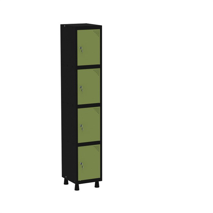 Armário Roupeiro de Aço totalmente montável, dispensa a utilização de parafusos, estrutura em chapas #24 e #26 (0,60mm e 0,45mm) conta com uma porta com estampos circulares em formação triangular para ventilação, sistema de fechamento de varão de 3 pontos, através de pitão para cadeado. Em conformidade com as normas NR17.