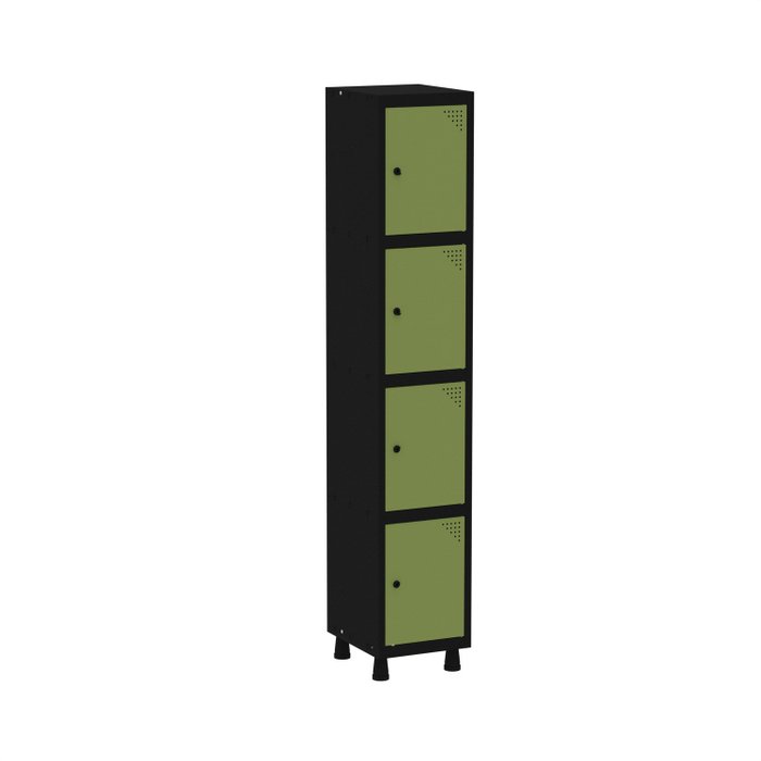 Armário Roupeiro de Aço totalmente montável, dispensa a utilização de parafusos, estrutura em chapas #24 e #26 (0,60mm e 0,45mm) conta com uma porta com estampos circulares em formação triangular para ventilação, sistema de fechamento de varão de 3 pontos, através de pitão para cadeado. Em conformidade com as normas NR17.