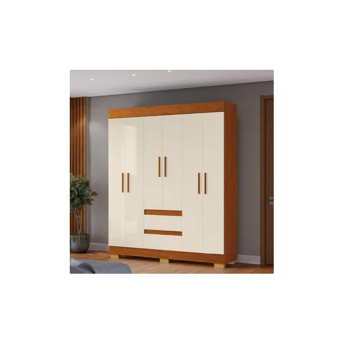 Roupeiro com 06 portas, 02 gavetas internas corrediças Telescópica.Estrutura e portas MDF de 12mm; fundos em MDF de 2,5mm.Pintura interna Linho. Cabideiro em alumínio. Pés inclusos na cor do produto Largura: 1.641 mm Altura: 1880 mm Profundidade: 397 mm Volume: 2 Peso: 77 Kg Cubagem: 0,1341 m³