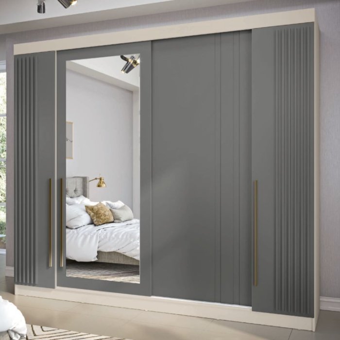 Um lindo roupeiro com design misto, com 4 portas, 2 sendo de bater e 2 sendo de correr, trazendo um ar de produto planejado, além de ser produzido em 100% MDF e ter uma profundidade excelente, esse produto vai deixar o seu quarto mias completo, sua cor em baunilha c/ cristal (grafite) vai transformar sua casa. Aproveite eleve hoje mesmo esse incrível guarda roupa.