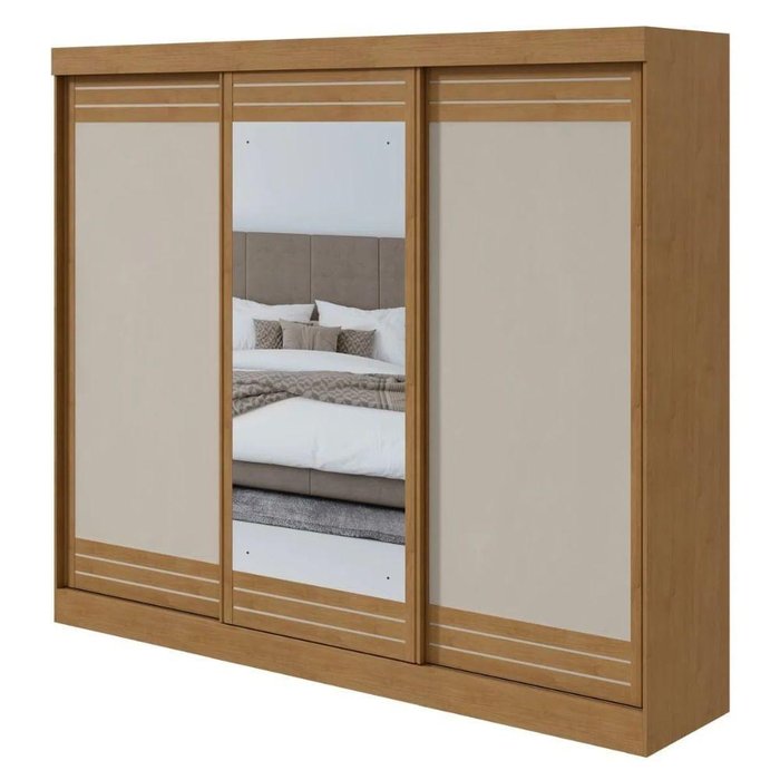 Roupeiro Nice Lopas 3 Portas Correr 270cm Com Espelho Amêndoa/off White