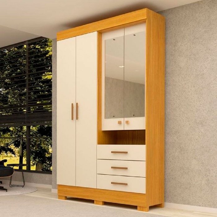 Roupeiro Solteiro Débora 4 Portas 3 Gavetas com Espelho Acp Móveis Nature com Off White