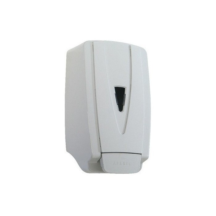 Saboneteira injetado em plástico ABS branco com detalhe central em “V” branco com botão “aperte” branco com visor em PS poliestireno cristal transparente o que facilita a visualização da quantidade do produto que ainda resta.