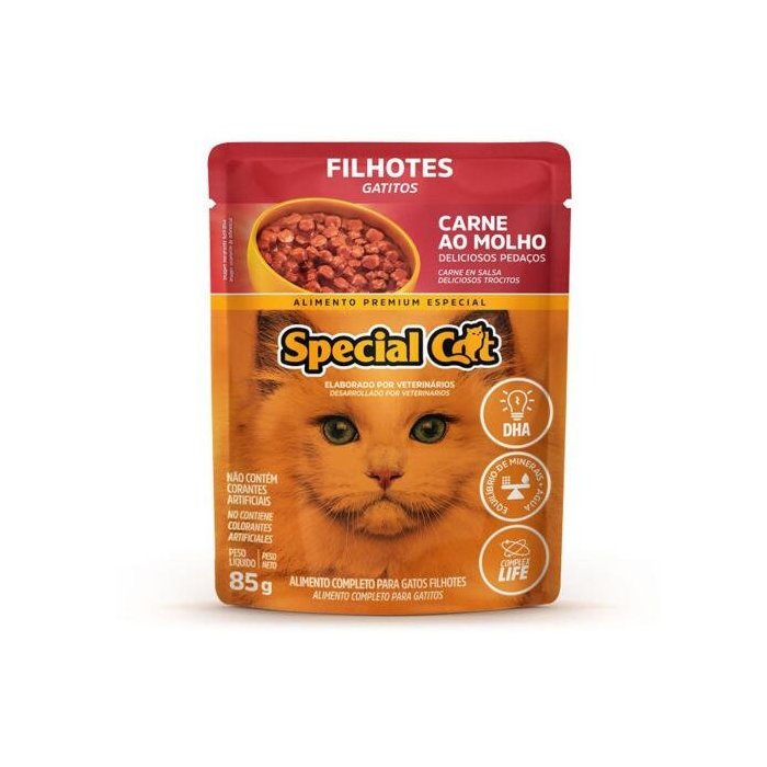 Sachê Special Cat Gatos Filhotes Carne 85G - Alta palatabilidade; - auxilia no trato urinário; - não contém corantes artificiais; - alimento completo e balanceado; - formulado com minerais facilitando a absorção pelo organismo; - contém dha, que auxilia na melhora da capacidade de aprendizagem. Especificações: Alimento úmido, completo e balanceado para gatos filhotes. Special cat sachê filhotes sabor carne é uma excelente combinação de saborosos pedaços macios, cozidos a vapor, com um suculento molho especial. Formulado com minerais orgânicos, complex life é facilmente absorvido pelo organismo, otimizando seus benefícios à saúde do animal. Os níveis equilibrados de minerais e o consumo de água, presentes no alimento úmido, auxiliam na manutenção do trato urinário. Possui dha essencial para o desenvolvimento cerebral do filhote, o dha atua na melhora da capacidade de aprendizagem. Composição: Miúdos de suínos, miúdos de aves, carne bovina, plasma sanguíneo suíno em pó, leite desnatado em pó, hemoglobina bovina em pó, gelatina, farinha de trigo, amido de milho, dextrose, proteína isolada de soja, proteína texturizada de soja, gordura de frango, celulose, levedura hidrolisada de cana-de-açúcar, farinha de algas schizochytrium sp. (0,3%), extrato de yucca schidigera, hidrolisado de fígado de frango e suíno, cloreto de sódio (sal comum), carbonato de cálcio, cloreto de potássio, água, glicina, taurina, dl-metionina, vitaminas (a, b1, b2, b3, b5, b6, b7, b9, b12, c, d3, e e cloreto de colina), minerais quelatados (glicinatos: cobre, ferro, manganês e zinco), levedura enriquecida com selênio, iodato de cálcio, sulfato de cobre, sulfato de manganês, sulfato de zinco, goma guar, carragena, tripolifosfato de sódio, edta cálcio dissódico, bha, bht, corante natural caramelo.