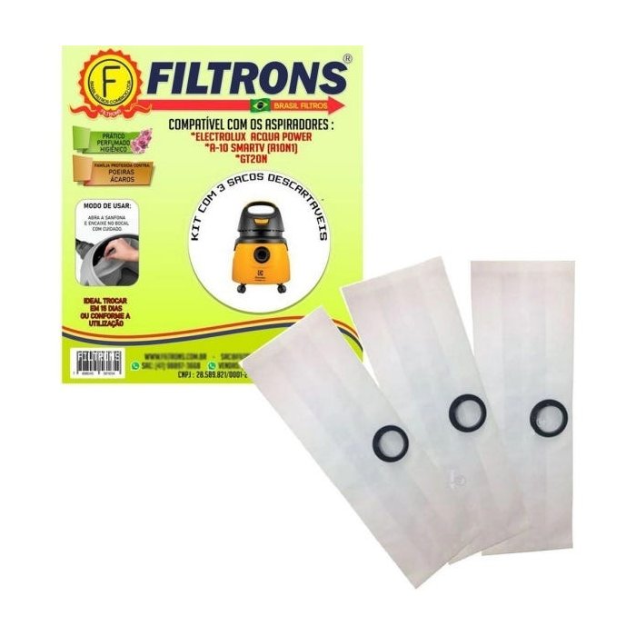 3 Sacos descartáveis para Filtro Aspirador de Pó, compatível com os aspiradores: - ELECTROLUX ACQUA POWER- A-10 SMART (A10N1)- GT20NKit com 3 sacos descartáveis. Prático, Perfumado e Higiênico.Saco protegido contra: Poeiras, Ácaros. MODO DE USAR: - Abra a sanfona e encaixe no bocal com cuidado. Ideal trocar de 15 em 15 dias ou conforme a utilização.ATENÇÃO:Imagem do saco, meramente ilustrativa. INFORMAÇÕES TÉCNICAS:Especificações: Diâmetro do cano do aspirador: 4 cm.Marca: FiltronsCódigo de fabrica: FI00228Código de barras: 7898045561654NCM: 48232099Peso: 0,13kgQuantidade no pacote: 3 unidades