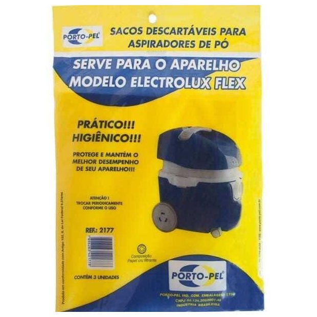 Saco De Aspirador De Pó Descartaveis Eletrolux Flex Ref2177Fabricante: PortopelREFERÊNCIA: 2177Modelo: Eletrolux FlexCONTÉM: 3 Unidades