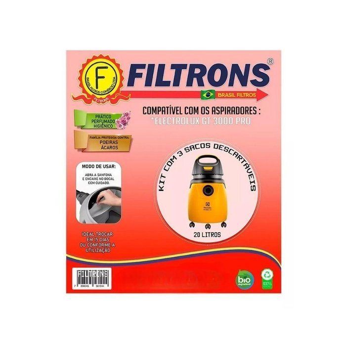 Apresentamos o Kit com 3 Sacos Descartáveis para Aspirador de Pó Electrolux GT3000 PRO, a escolha perfeita para manter seu aspirador funcionando com o máximo desempenho e higiene. Práticos, perfumados e higiênicos, os sacos descartáveis Filtrons garantem a retenção de poeiras, ácaros e outros agentes alergênicos, proporcionando um ambiente mais limpo e saudável para você e sua família. Informações Técnicas Marca: Filtrons