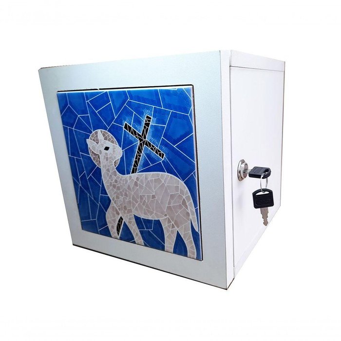 Sacrário de madeira Branco - O Cordeiro Imolado + Chaveiro Exclusivo O Sacrário de madeira Branco - O Cordeiro Imolado possui um design elegante e imponente, perfeito para agregar beleza e significado a qualquer espaço sagrado. Feito em madeira de alta qualidade , ele apresenta uma imagem em azulejo do Cordeiro Imolado no centro, simbolizando a oferta sacrificial de Jesus Cristo pela salvação da humanidade. Com aproximadamente 30 cm de altura, esse sacrário é ideal para acomodar a Óstia, o Corpo de Cristo, de forma respeitosa e reverente, proporcionando proteção e delicadeza ao abrigar o Santíssimo Sacramento. O Sacrário é exclusivo e feito em madeira branca , simbolizando a paz e a leveza, além de acompanhar fechadura e chaves.Além de tudo isso, o Sacrário acompanha um lindo chaveiro com arte sacra.. Além de sua função litúrgica, o Sacrário de madeira Branco - O Cordeiro Imolado também é uma peça de decoração majestosa, que pode ser incorporada à estética de igrejas, capelas e até mesmo de ambientes religiosos dentro de residências. Caracteristicas do Produto : Material : Madeira Medidas : 30 X 30 cm Azulejo : 20 X 20 cm