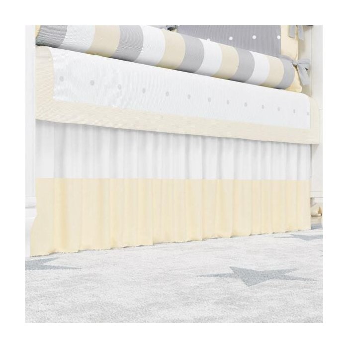 A Saia de Berço Branco/Amarelo é um produto exclusivo da Grão de Gente, principal marca de enxoval e decoração para quarto de bebê da América Latina. Esse acessório enriquece a decoração do quarto de bebê com duas caídas franzidas para cobrir o espaço abaixo do colchão e esconder o estrado do berço com charme e movimento.