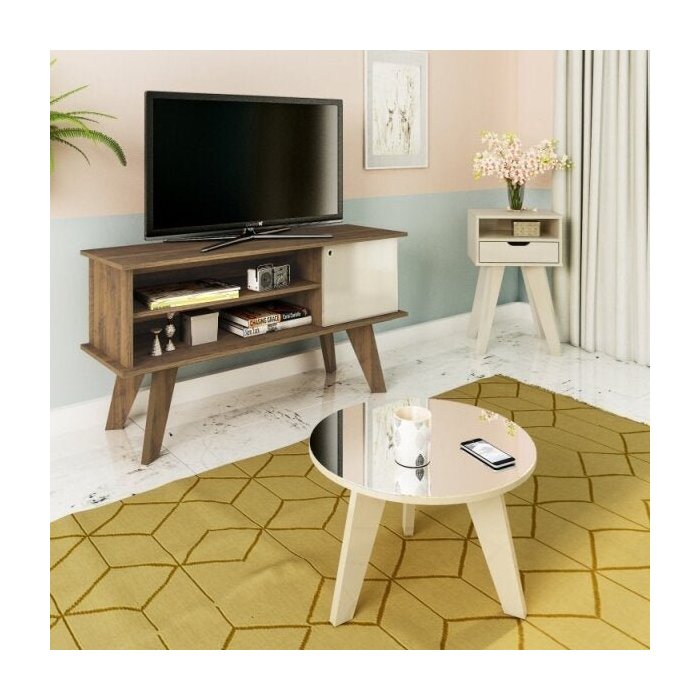 Sala de Estar com Rack Frank, Mesa de Centro Espanha e Mesa de Apoio Vip Pinho/Off White