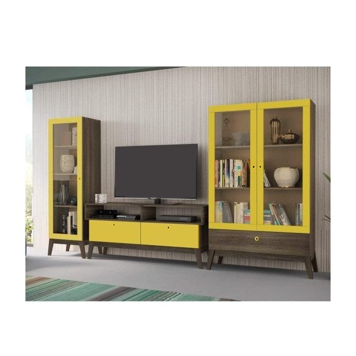 Sala de Estar Completa com Rack, Cristaleira 1 Porta e Cristaleira 2 Portas Retrô Madri Espresso Móv Amarelo/Demolição