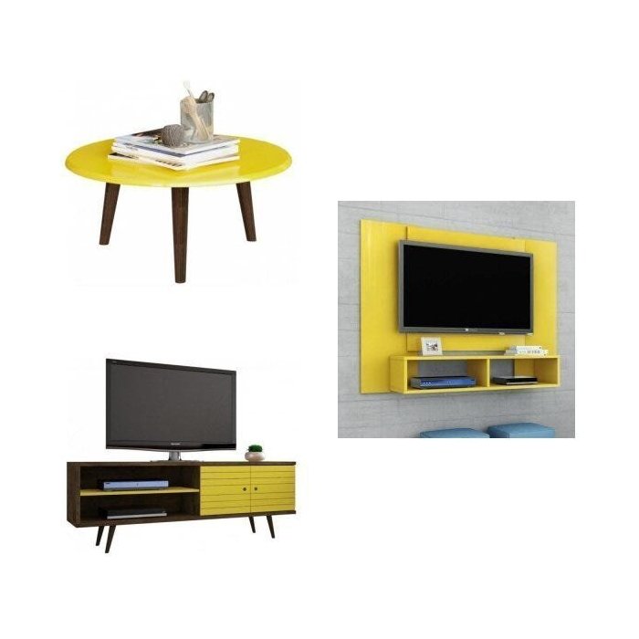 Sala de Estar Completa Espresso Móveis com Painel, Rack e Mesa 376610 Amarelo/Marrom