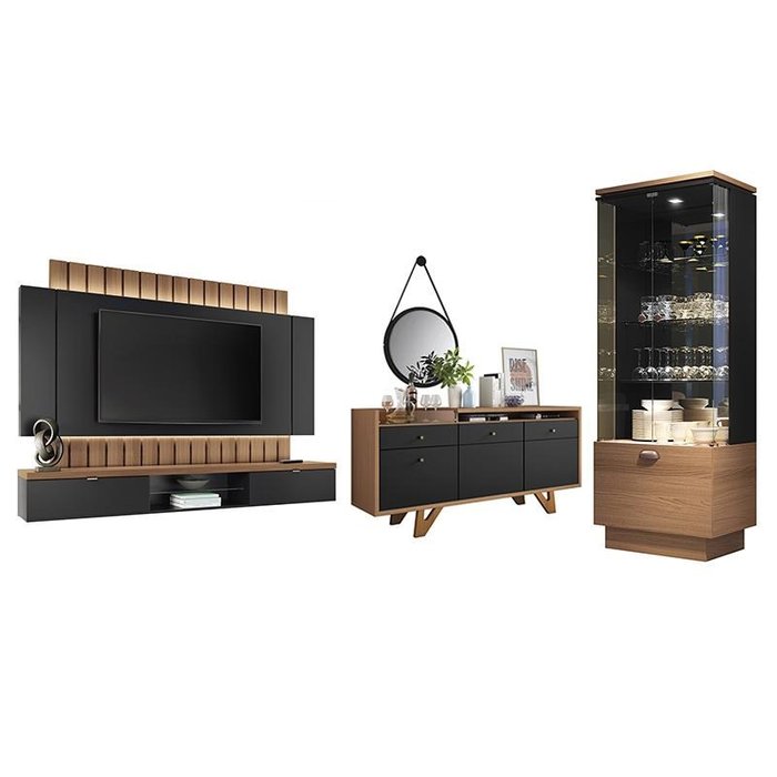Sala de Estar Diamante Home Suspenso 2.2, Buffet Aparador, Cristaleira e Espelho Nature/Preto - PR M