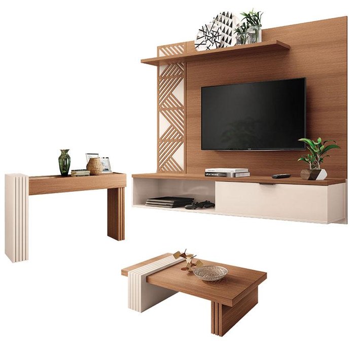 Sala de Estar Painel Suspenso Grid com Aparador Astro e Mesa de Centro Luna Nature Off White - HB Móveis