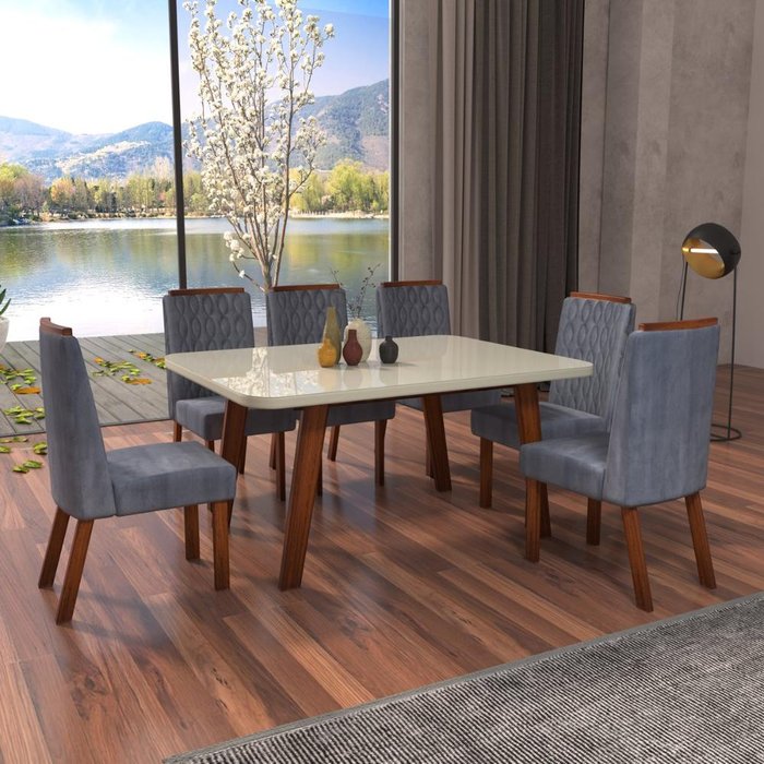 A Sala de Jantar Alba Bom Pastor é uma novidade que estamos lançando em nosso mix de produtos, conta com 6 cadeiras Viena Luxo. Com um design moderno e inovador a mesa Alba 100% MDF possui a borda em PVC super-resistente, vidro 4mm e tampo barril com quina arredondada com 160 x 80 cm. Com uma proposta aconchegante, possui encosto tipo anatômico, espuma selada, 100% MDF e revestimento em tecido especial.