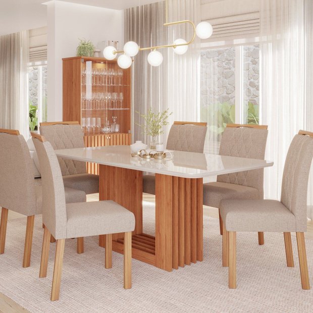 A mesa Ariela é o equilíbrio perfeito entre design e funcionalidade. Sua base em MDF com detalhes ripados traz um toque de sofisticação e modernidade, enquanto a fixação oculta oferece uma estética limpa e elegante. O tampo em MDF com vidro combina resistência e requinte, tornando-o ideal para compor espaços que valorizam estilo e durabilidade. A cadeira Juliana representa a fusão perfeita entre elegância, conforto e praticidade. Sua estrutura é habilmente confeccionada em madeira, conferindo-lhe não apenas uma base sólida e durável, mas também um toque de rusticidade refinada que complementa diversos estilos de decoração. O assento e o encosto da cadeira são revestidos com estofamento de alta qualidade, proporcionando uma experiência de conforto excepcional.