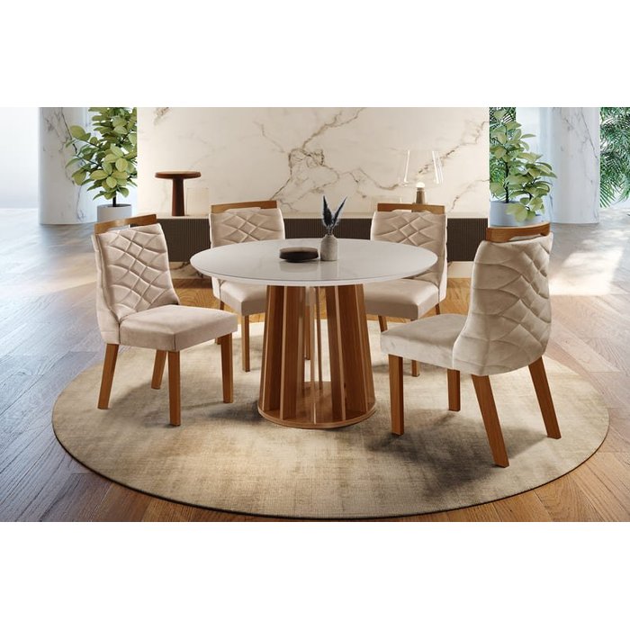 O Conjunto de jantar 4 lugares Dália é moderno e lindo, com ele qualquer ambiente fica chique e prazeroso. As Cadeiras possuem encostos no formato anatômico e detalhe em MDF acima do encosto estofado. A Mesa conta com tampo de acabamento UV e vidro serigrafado / temperado de 4mm, que traz mais durabilidade para seu produto.
