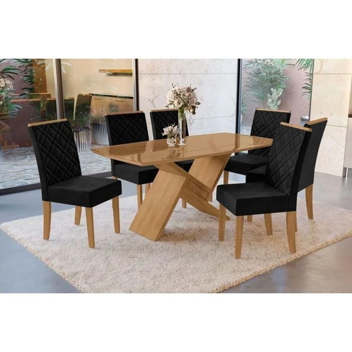 Sala de Jantar Completa Didal Tampo Madeirado C- Vidro 90x170cm e 6 Cadeiras 2cad149 Nogueira-vidro Preto
