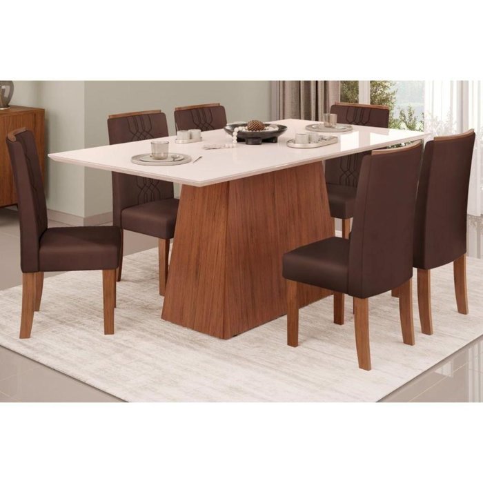 Sala de Jantar Completa Dulce Tampo Madeirado C- Vidro Reto 180x90cm e 6 Cadeiras Zoe Freijo-off Branco