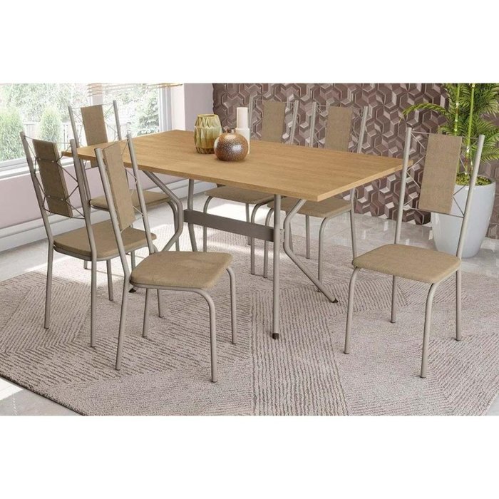 Abaixo segue os produtos do KIT: Sala de Jantar Completa Loire Tampo Madeirado 90x160cm e 6 Cadeiras Lisboa Niquel/Nogueira - Capuccino - Kappesberg