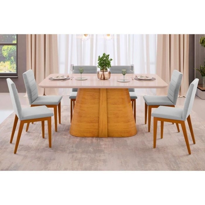 Sala de Jantar Completa Ryze Tampo Madeirado C- Vidro Curvo 180x100cm e 6 Cadeiras Sofia Cedro-off