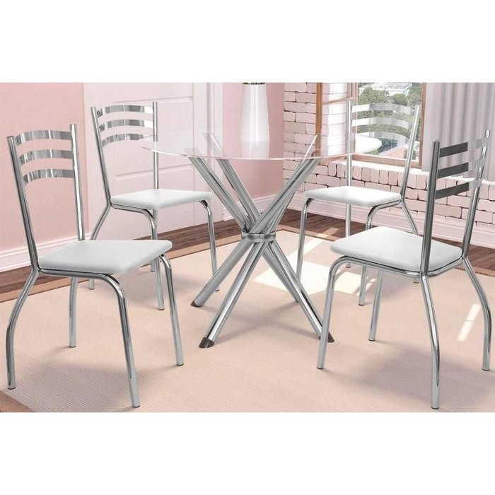 Sala de Jantar Completa Volga C/ Tampo de Vidro 95cm e 4 Cadeiras Portugal Cromada - Branco -