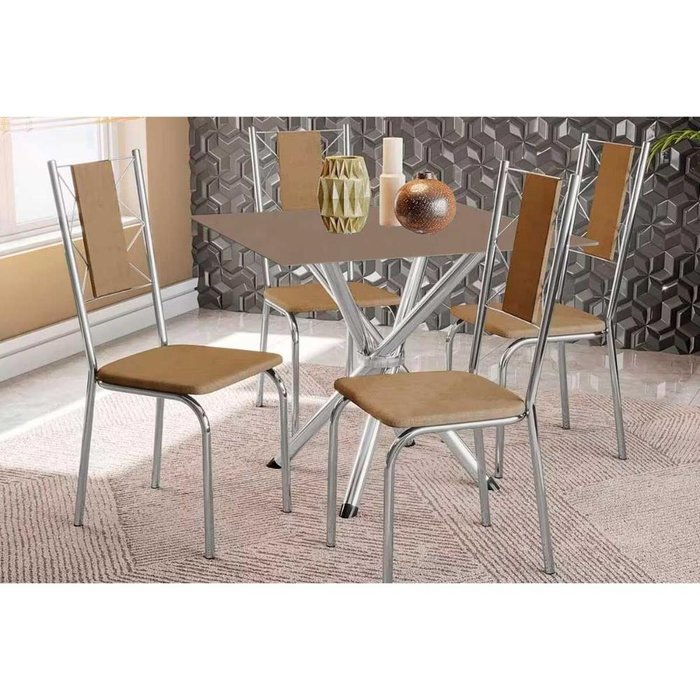 Sala de Jantar Completa Volga Tampo Madeirado C/ Vidro 105x105cm e 4 Cadeiras Lisboa Cromado/freijo/ capuccino