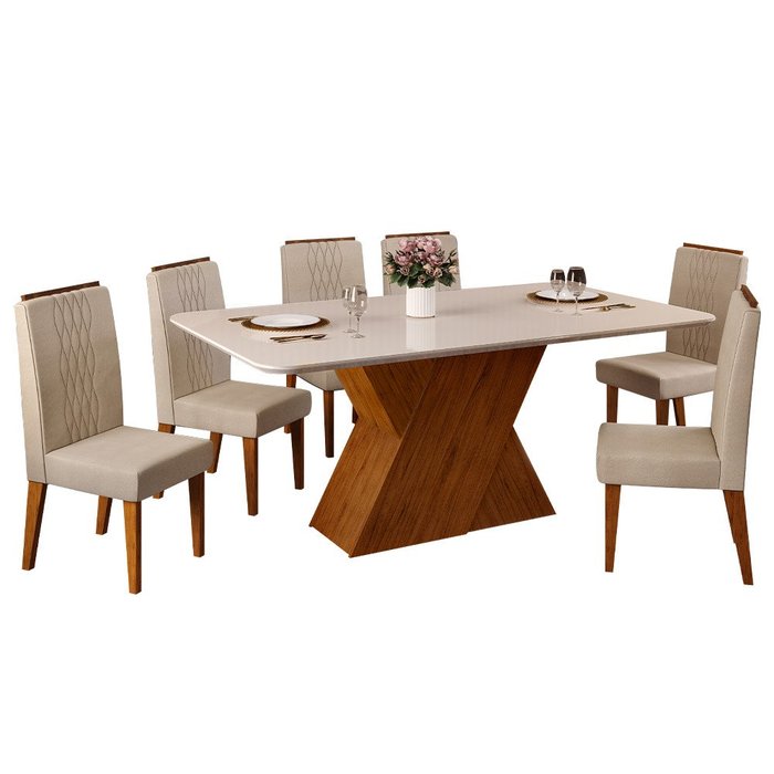 Sala de Jantar DJ Móveis Rubi Tampo Chanfrado Curvo 170x0,25 com 6 Cadeiras Lia