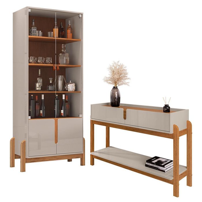 Renove sua sala de jantar com o Conjunto Lizz, que inclui a Cristaleira e o Aparador. A Cristaleira Lizz combina elegância e funcionalidade com portas de MDF usinadas e vidro temperado, além de dobradiças soft-close e prateleiras internas para organização. O Aparador Lizz oferece design moderno com tampo e laterais em MDF, duas gavetas de deslizamento suave, e pés de madeira maciça com um toque retrô. Ambos os móveis têm acabamento em pintura UV para maior durabilidade. Juntos, eles trazem sofisticação e praticidade à sua sala de jantar.