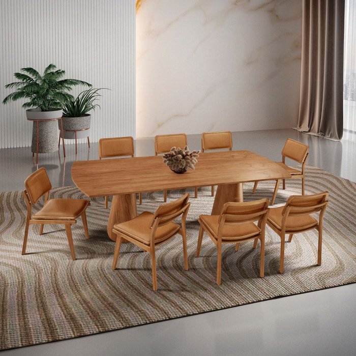 As cadeiras Eva complementam esse conjunto com um toque ainda mais natural. Feitas em madeira maciça e cuidadosamente estofadas no assento e encosto, proporcionam o equilíbrio perfeito entre conforto e design. Seu formato envolvente acolhe e convida a desfrutar de momentos inesquecíveis ao redor da mesa.
