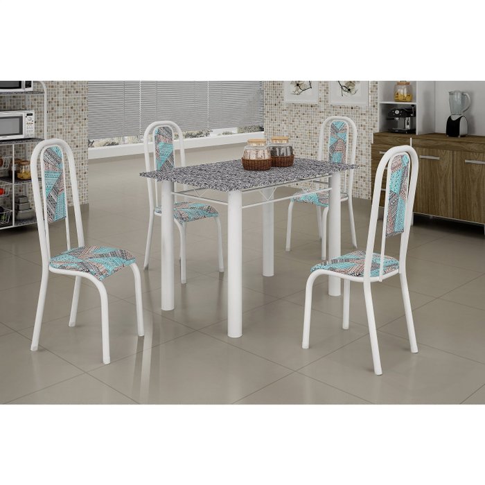 Sala de Jantar com 4 Cadeiras Parati, seu design deixa o ambiente mais funcional e seguro, ideal para quem procura praticidade e conforto. Os pés da base da mesa são em tubo, contendo sapatas plásticas nos pés para evitar arranhões no piso. Tampo da mesa em pedra de Granito. Cadeiras em tudo, assentos e encostos revestidos em espuma e tecido, pintura eletrostática a pó na cor Branco.