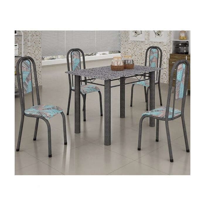 Sala de Jantar Mesa Retangular Tampo de Granito 4 Cadeiras Parati Uai Móveis Prata Martelado