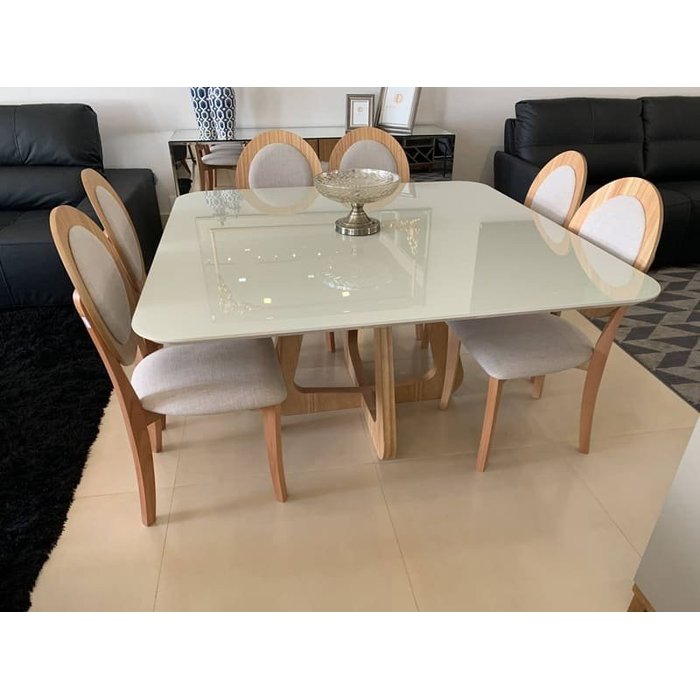A Mesa de Jantar Música possui um design diferenciado com muito estilo. Com detalhes elegantes e materiais de extrema qualidade e durabilidade. Base em madeira maciça de eucalipto e tampo em MDF revestido com lâmina de madeira maciça e vidro sobreposto de 4mm. E as cadeiras Medalhão tem um design clássico com encosto alongado que trazem um charme todo especial. São essenciais para você que adora recepcionar amigos, convidados e familiares na sua casa. Fabricada em madeira maciça de eucalipto, ela possui encosto de MDF com detalhe em tecido e assento estofados com espuma D-26. Sua sala de jantar vai ficar um arraso com essa composição! Aproveite!