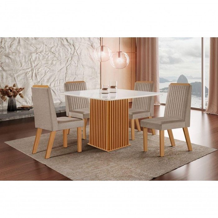 Sala Riviera 0,90x0,90 Vidro 4mm Cinamomo Off 4 Cd-lj - Suedy Creme - Tec164 Mesa LJ RIVIERA Para 4Cadeiras Com Vidro Off White - Castanho Cinamomo A Mesa LJ é uma opção elegante e funcional para compor a sua sala de jantar. Com um design moderno, ela é projetada para acomodar 4 cadeiras, proporcionando conforto e estilo para suas refeições e encontros familiares. Características:Modelo: RIVIERACapacidade: Para 4 cadeirasCor do Tampo: Off WhiteCor da Base: Castanho CinamomoMaterial do Tampo: Vidro 4mm espessuraMaterial da Base: MDFAcabamento: Pintura UVDimensões Aproximadas:Altura: 80 cmLargura: 90 cmProfundidade: 90 cmO tampo em vidro confere sofisticação ao conjunto, enquanto a estrutura em MDF com acabamento em pintura UV oferece durabilidade e resistência. A combinação das cores Off White e Castanho Cinamomo agrega um toque de contemporaneidade ao ambiente. Com a Mesa LJ , você terá um espaço agradável e convidativo para compartilhar refeições com amigos e familiares. Seu design versátil permite harmonização com diversos estilos de cadeiras, possibilitando a criação de uma sala de jantar personalizada e única. Transforme sua sala de jantar com a Mesa LJ . Adquira já e desfrute de momentos especiais com muito conforto e beleza! MESA RIVIERA ALTURA : 80,00 LARGURA: 90,00 COMPRIMENTO : 90,00 VIDRO SERIGRAFADO TEMPERADO 4MM TAMPO TAMBURATO CHANFRADO CADEIRA RIVIERA ALTURA : 99,00 LARGURA: 43,00 PROFUNDIDADE: 54,50 TECIDO LINHO BEGE CLARO