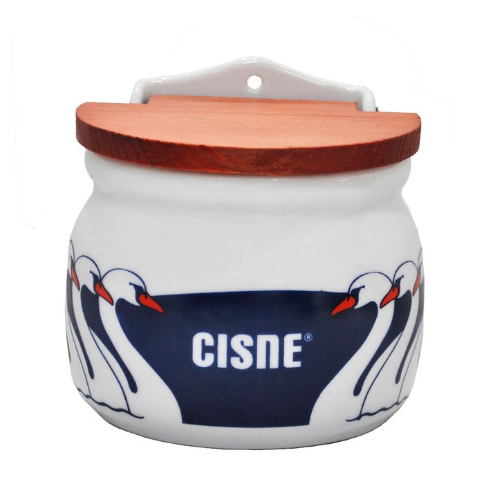 Produzido em porcelana de alta qualidade e resistência, o saleiro tem tampa de madeira e decalque da marca de sal Cisne, a peça é puro charme e delicadeza.