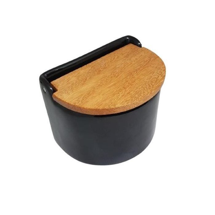 Saleiro De Porcelana Preto Com Tampa De Madeira