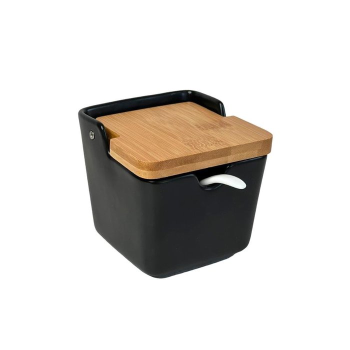 Saleiro em Cerâmica Preto com Tampa de Bambu e Colher Preto