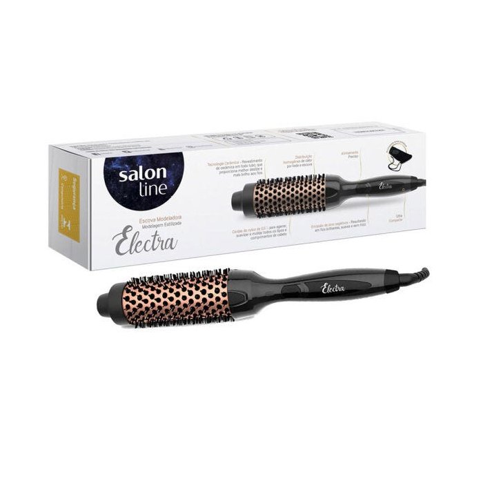 A Linha de elétricos da Salon Line é um verdadeiro infinito de transformação ao alcance de suas mãos, é direcionada aos profissionais cabeleireiros e aos consumidores, que são incríveis e únicos, assim como os nossos produtos.A linha traz tecnologia de ponta, praticidade e excelência. A embalagem é didática que ensina o consumidor qual a melhor forma de utilizar seu aparelho, para isso levamos em consideração potência, performance, tipo de cabelo, além de inúmeras outras variáveis, isso tudo para facilitar o manuseio e proporcionando melhor resultado para quem utiliza.A escova modeladora Electra da Salon Line tem revestimento de cerâmica em todo tubo, que proporciona melhor deslize e mais brilho aos fios, suas cerdas são de nylon de 0,5mm, suaviza e molda todos os tipos e comprimentos de cabelo.Escova Modeladora Bivolt Electra Salon Line 38mmModelagem perfeitaAquecimento em 90 segundosEmissão de íons negativosTecnologia cerâmicaDistribuição homogênea de calor por toda a escovaCerda de nylon com 0,5mm de espessuraUltra compactaTecnologia antifrizz200ºcAcompanha bolsa protetoraTensão: bivolt