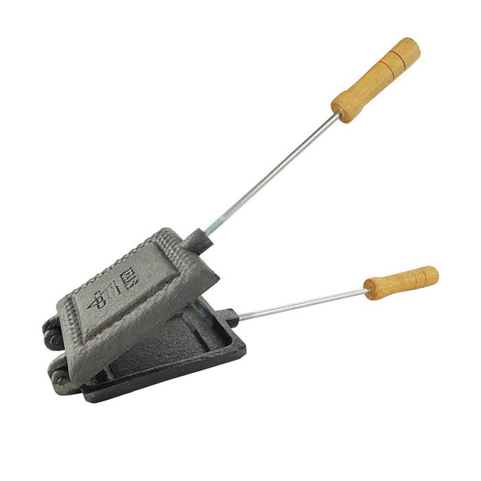 A sanduicheira de Ferro Fundido Casa e Jardim tem a capacidade para 1 Pão de forma. Medidas 12cm x 12 cm. Cabo em aço com pegador em madeira não esquentam. Cabo com 23 cm.