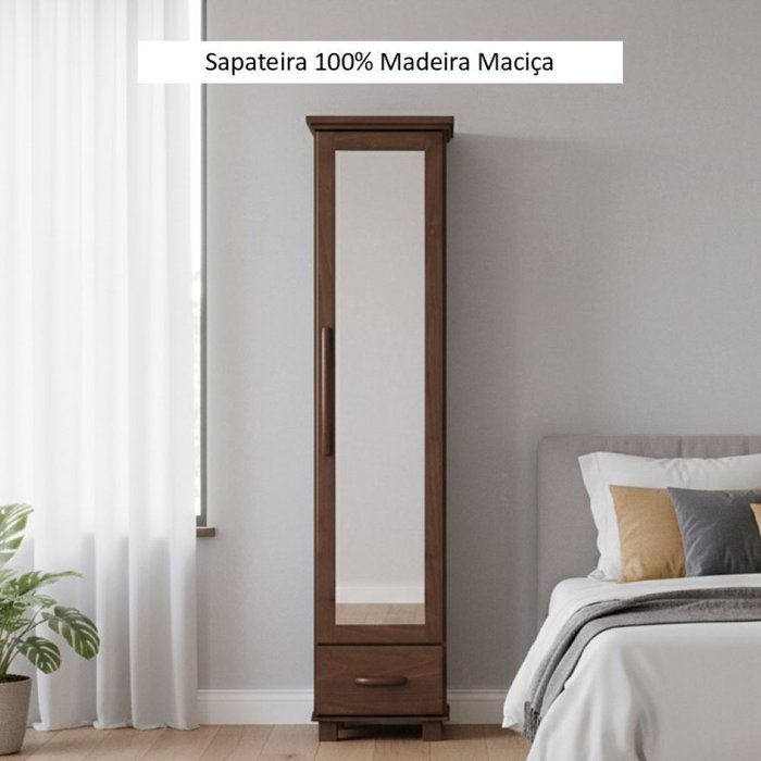 A Sapateira com Espelho da Linha Ouro é feita 100% de madeira maciça. O acabamento é em Verniz Acetinado PU e UV.