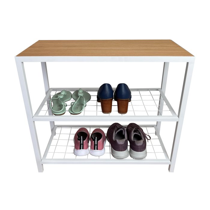 Ela conta com 2 prateleiras internas onde é possível colocar cerca de 6 pares de calçados, sua base superior é feita em tampo de MDF que trás a sensação de aconchego. Esta base pode ser utilizada para colocar outros pares de calçados ou também pode servir como banco já que suporta até 200kg.