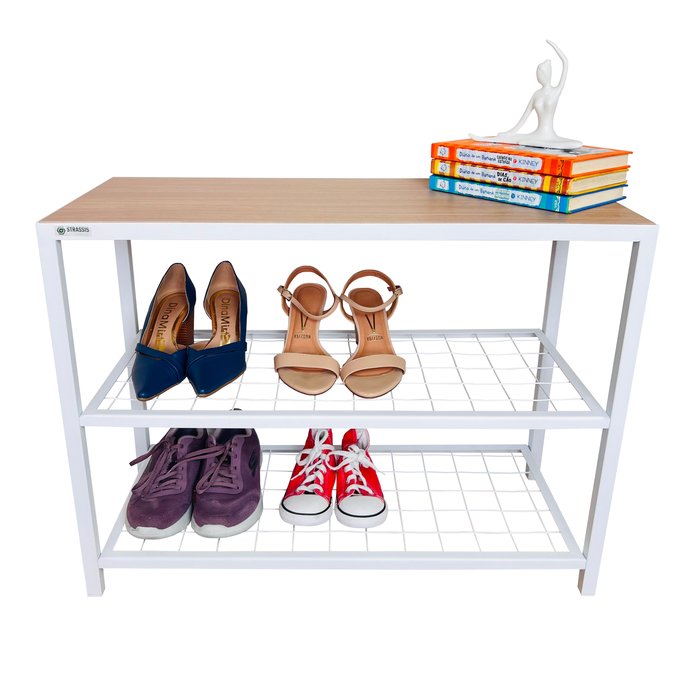 Ela conta com 2 prateleiras internas onde é possível colocar cerca de 8 pares de calçados, sua base superior é feita em tampo de MDF que trás a sensação de aconchego. Esta base pode ser utilizada para colocar outros pares de calçados ou também pode servir como banco já que suporta até 200kg.