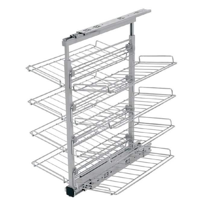 | Detalhes do Produto | Estrutura fabricada em aço com acabamento em pintura. Cestos aramados fabricados em aço carbono com acabamento cromado. Corrediças telescópicas de 450mm galvanizadas. Largura de 490mm. Altura de 660 a 950mm (ajustável conforme seu projeto). Profundidade de 470mm. |