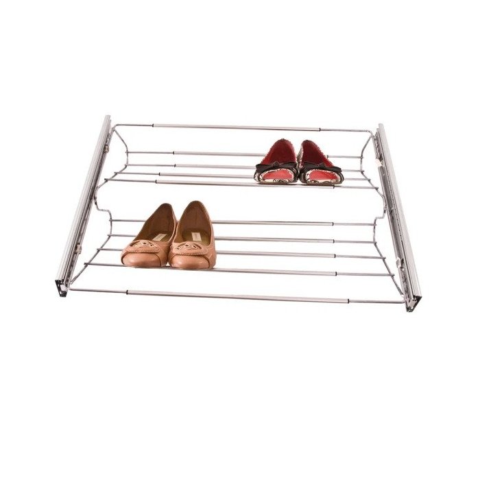 | Detalhes do Produto | • Tubos extensores em alumínio com trilhos telescópicos zincados. • Capacidade mínima de 6 pares de calçados. • Para módulos de 600 mm a 800 mm. • Para uso em nicho. • Acabamento Cromado. |