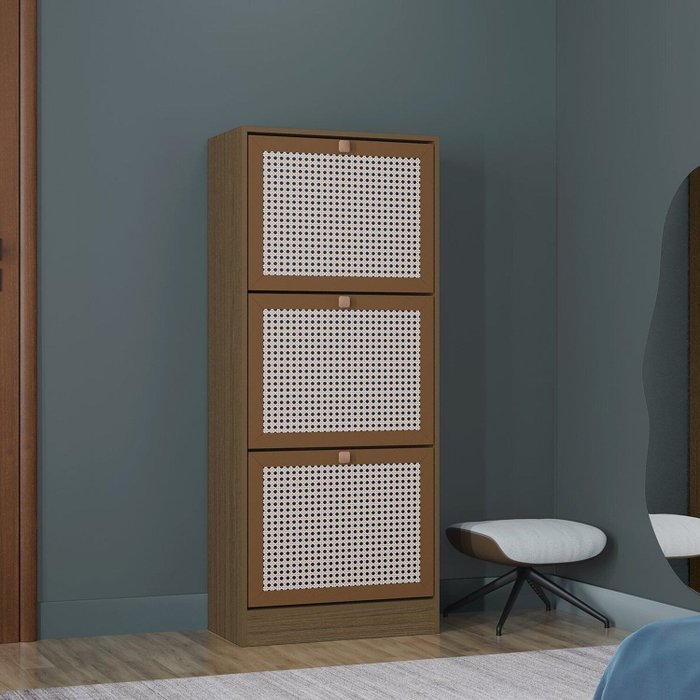 É uma sapateira vertical com três portas, feita em BP (laminado decorativo de baixa pressão), um material resistente a riscos, umidade e manchas. As portas têm pintura 3D que imita palha indiana, dando um toque sofisticado ao móvel. Serve para organizar sapatos de forma prática e discreta. Com três compartimentos internos, ela ajuda a manter o ambiente limpo e os calçados protegidos e acessíveis. É versátil e pode ser usado em quartos, closets, lavanderias, hall de entrada. Ambientes modernos, decoração minimalista, elementos naturais.
