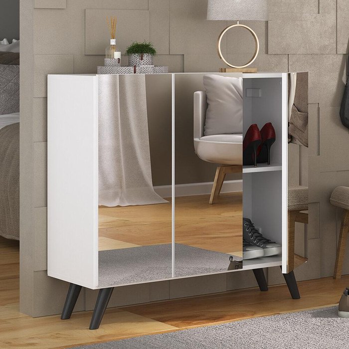 A Sapateira Retrô com Espelho 3 Portas Nina Multimóveis é produzida em MDP com acabamento acetinado (cerca de 20% de brilho), que garante maior durabilidade, facilidade na limpeza, além de um acabamento superior. Com 3 portas, possui um excelente espaço interno para acomodar seus sapatos e demais pertences (as prateleiras internas suportam 2 e 5 Kg e o tampo 7 Kg). Os pés retrô, em polipropileno, dão um charme especial ao móvel deixando-o com um visual leve e permitindo você compor um ambiente com ar vintage e moderno ao mesmo tempo. Os espelhos na porta deixam o móvel mais requintado, criando um ambiente moderno e charmoso. Os espelhos são de vidro (o que evita que a imagem fique distorcida) e lapidados, ou seja, passam por um processo para que as bordas não fiquem cortantes, o que garante maior segurança. Compacta, é uma excelente opção para otimizar seu ambiente, para que você possa aproveitá-lo da melhor maneira possível.