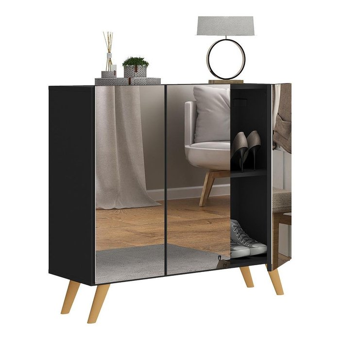 Sapateira Retrô com Espelho 3 Portas Nina Multimóveis V6022 Preta/Natural