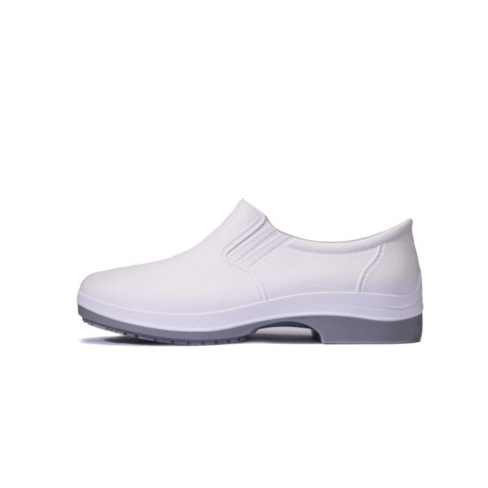 Calçado ocupacional, para a proteção dos pés contra agentes abrasivos e escoriantes, contra umidade proveniente de operações com uso de água, com solado resistente ao escorregamento em piso de cerâmica contaminado com Lauril Sulfato de Sódio (detergente) e em piso de aço contaminado com glicerina (óleo). Solado resistente ao óleo combustível, com absorção de energia na região do calcanhar.