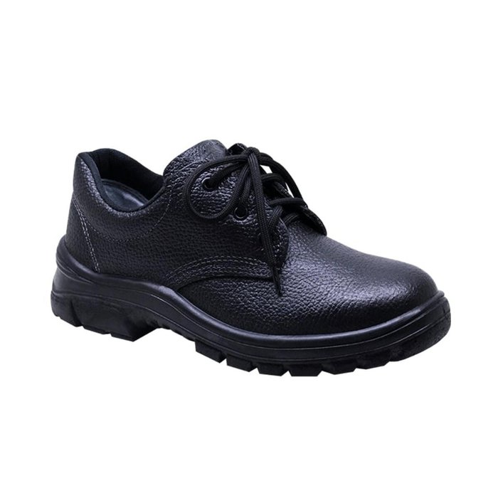 Calçado ocupacional tipo sapato, confeccionado em couro curtido ao cromo, fechamento em cadarço, palmilha de montagem em não tecido, solado em poliuretano monodensidade, sem biqueira de aço, resistente ao escorregamento em piso cerâmico contaminado com lauril sulfato de sódio (detergente) SRA, resistente a energia de impacto na área do salto (E), resistente a óleo combustível (FO).