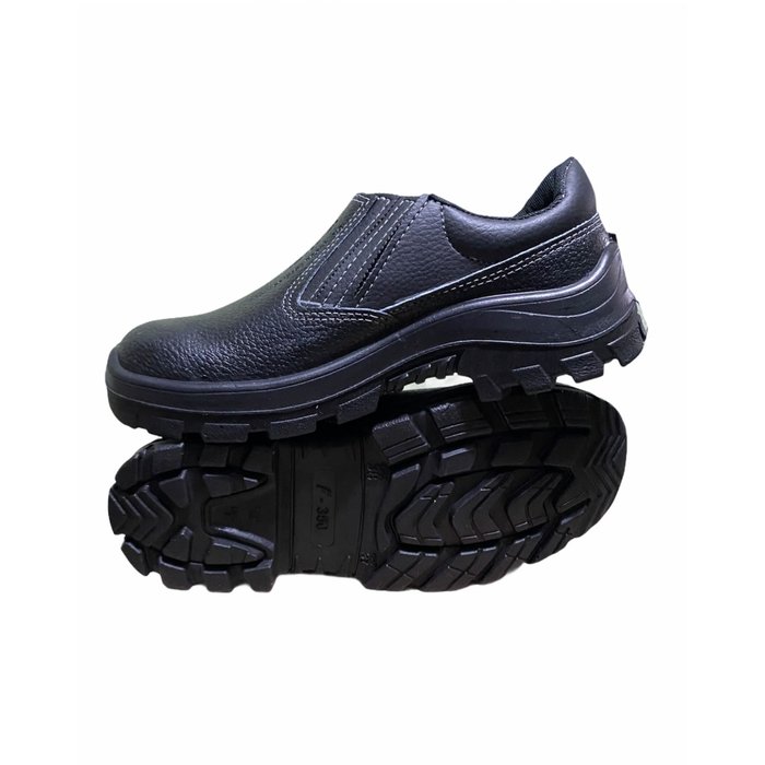 Calçado ocupacional básico, modelo sapato, constituído de couro, desenho do cabedal tipo (A), fechamento em elástico. Sistema strobel com palmilha de montagem em não tecido e injeção direta do solado no cabedal. Região do salto totalmente fechado, com resistência ao escorregamento, solado bidensidade.